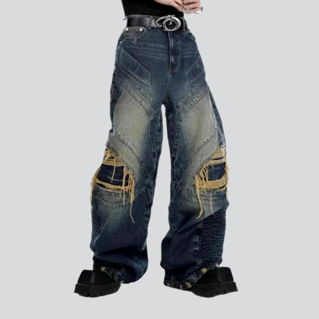 Esta pieza única es perfecta para quienes buscan expresar su individualidad y lucir su estilo de alta costura. Con su corte holgado, denim desgastado, patchwork de inspiración vintage y cintura alta, es una prenda tradicional que conecta con todos los creadores de tendencias.