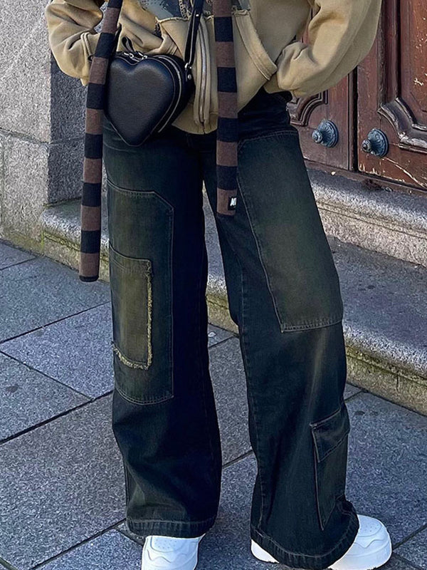 Descripción: Presenta detalles parcheados en la pierna. Tiene paneles de bolsillo con diseño de borde deshilachado. Tiene forma de pierna recta y una bragueta con cremallera y botón de metal en la parte delantera.