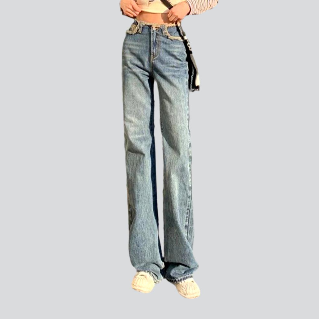 Luce un estilo moderno y sofisticado con estos jeans rectos de tiro alto e inspiración vintage de la colección Primavera-Verano 2023. Con cierre de cremallera y botón, estos jeans representan lujo y clase. Confeccionados en denim de primera calidad, son informales y duraderos, y prometen ser una prenda imprescindible para tu armario. Adornados con intrincados detalles estampados, son la combinación perfecta de encanto tradicional y estilo contemporáneo: ¡serás la envidia de todos!