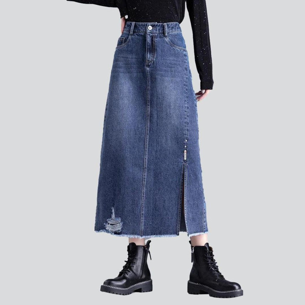 Dale un aire noventero a tu armario con la falda vaquera larga con borde rasgado de la colección de otoño 2023. Esta belleza de cintura alta está confeccionada en denim de lujo y cuenta con cierre de cremallera y botón. Te garantiza un aspecto impecable y una sensación impecable. Con un lavado medio y un atrevido bajo sin rematar, esta falda es imprescindible para cualquier amante de la moda.