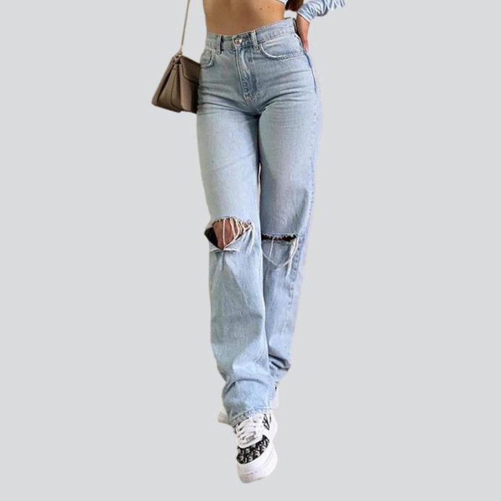 Presentamos nuestra Colección Primavera-Verano 2023 para mujer: jeans rectos, rotos y de cintura alta con cierre de cremallera y botón. Sumérgete en el lujo y el estilo con esta pieza de moda de impecable confección.