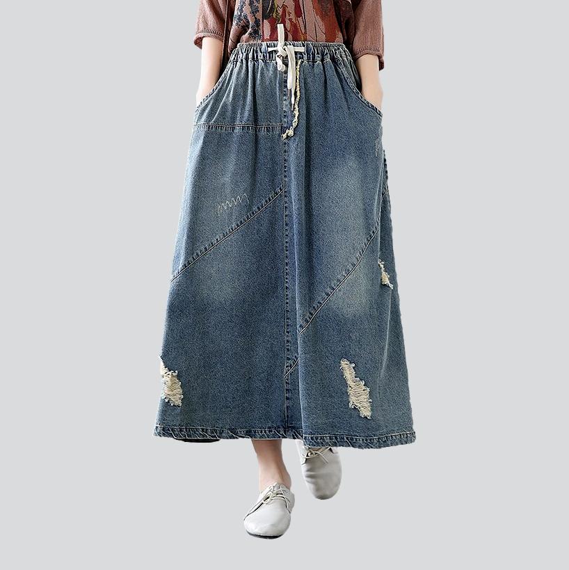 Combinando la clásica falda vaquera alargada con un toque moderno, esta prenda esencial te mantendrá a la moda. Su cintura alta y cierre de cordón te dan un ajuste favorecedor, mientras que sus exclusivos detalles de parches y rotos crean un look urbano audaz.
