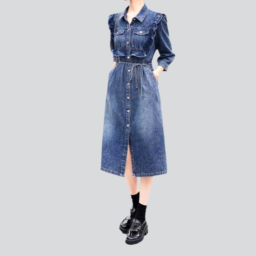 Da la bienvenida a esta temporada con una explosión de nostalgia: presentamos nuestro vestido vaquero largo con volantes en el pecho. ¡Un estilo del siglo XX de la colección primavera-verano 2023!