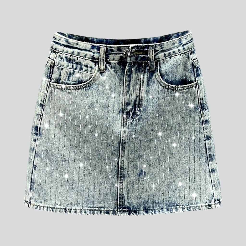 Esta falda vaquera está diseñada para lograr la silueta perfecta. Con tiro medio y un estilo holgado y alegre, está adornada con brillantes diamantes y es un auténtico testimonio de sofisticación y glamour clásico.