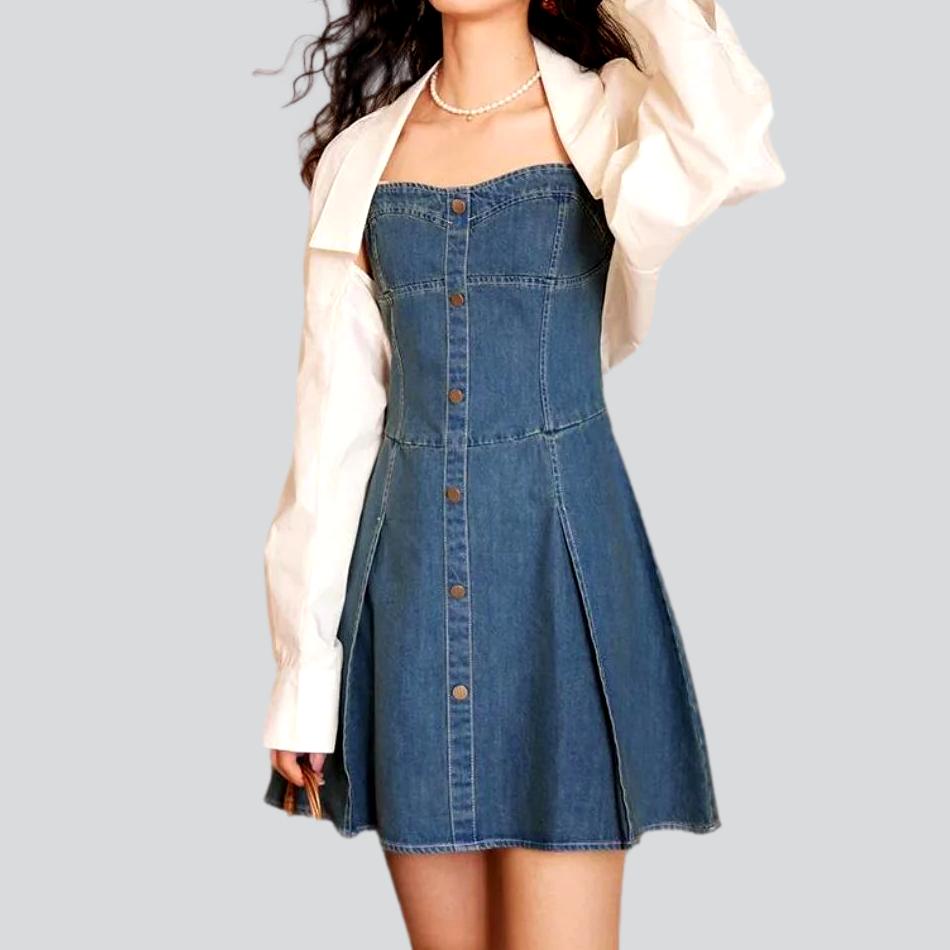 Presentamos nuestro minivestido vaquero acampanado sin tirantes inspirado en el milenio de la colección primavera-verano 2023: ¡un viaje al pasado con un toque de alta costura!