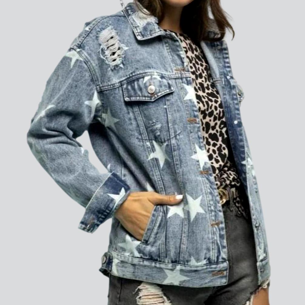 Haz una declaración con la chaqueta vaquera desgastada con estampado de estrellas de nuestra colección Primavera-Verano 2023, ¡una pieza atemporal que fusiona el estilo urbano clásico con la moda de vanguardia!