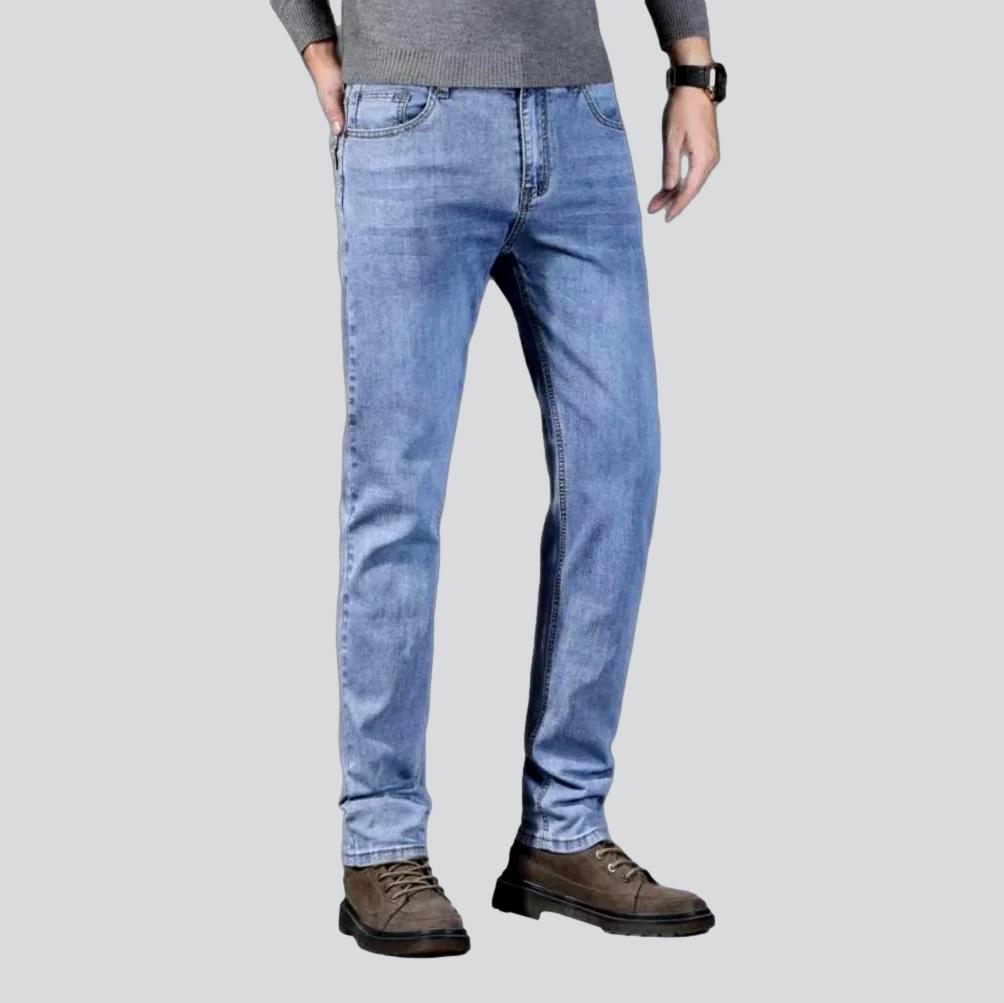 Consigue un look atemporal con los vaqueros rectos elásticos de corte recto para hombre , de inspiración premilenio, lavados a la piedra, de nuestra colección Primavera-Verano 2023. Con cintura alta y cierre de cremallera y botón, esta prenda ofrece el equilibrio perfecto entre la sensibilidad de la moda moderna y la nostalgia vintage.
