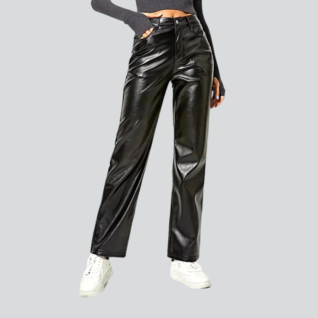 Estos pantalones lucen una silueta clásica Y2K con un acabado encerado vanguardista. Perfectos para la fashionista moderna con un toque nostálgico. Cada detalle, desde la cintura alta hasta el cierre de cremallera y botón, promete transformar tu look en una obra maestra atemporal.