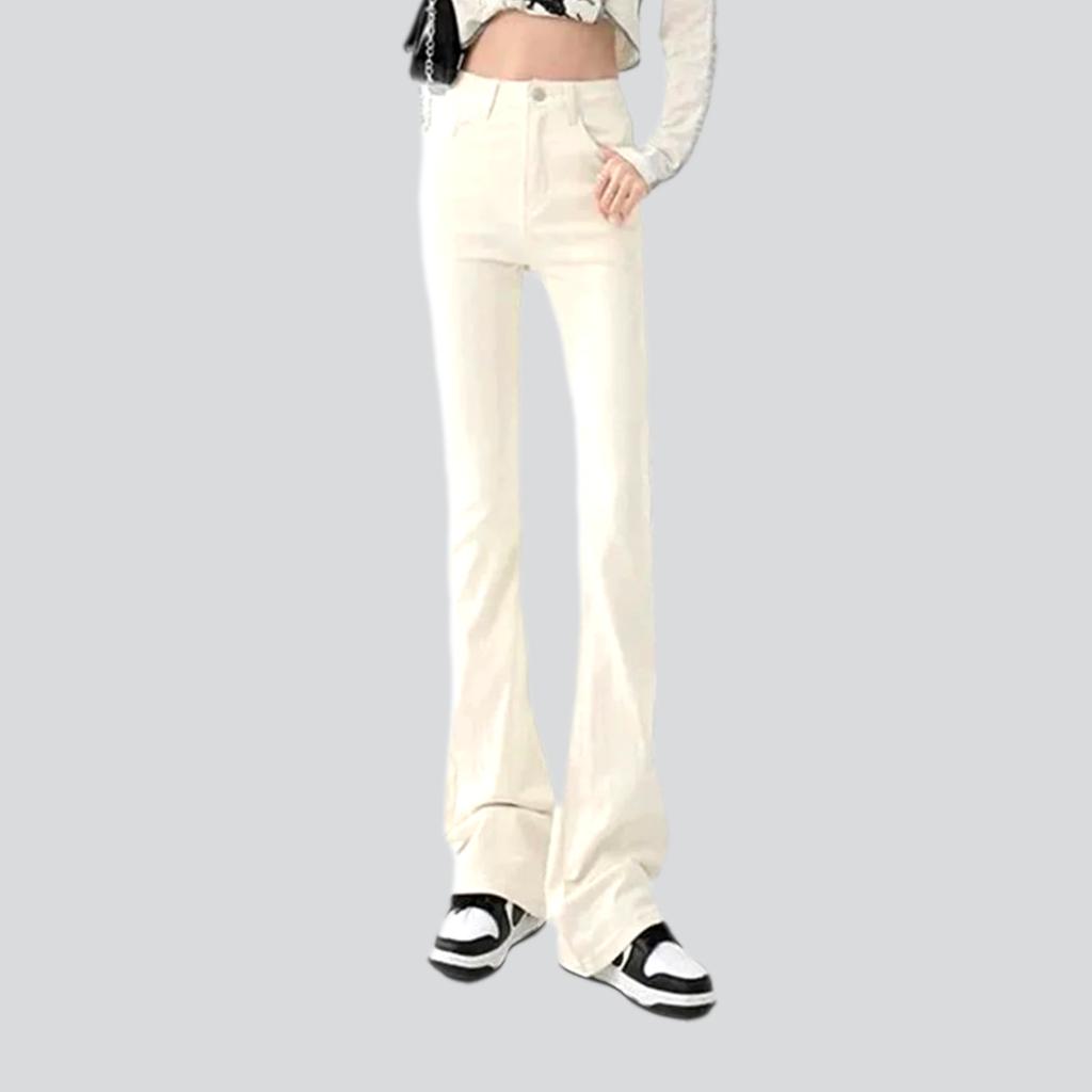 Estos jeans marfil de un solo color destacan con su cintura alta y corte bootcut. Elaborados con los mejores materiales, su textura favorece cualquier figura. Con cierre de cremallera y botón para una comodidad duradera, puedes usarlos para ocasiones formales o informales.