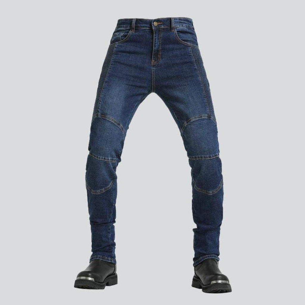 Estos jeans estilo motero están confeccionados con kevlar y lavados a la piedra, lo que les da un toque único. El corte entallado se adapta a tu silueta y el corte a media cintura le da un toque de clase. Además, el cierre de cremallera y botón garantiza un ajuste ceñido que no te defraudará.
