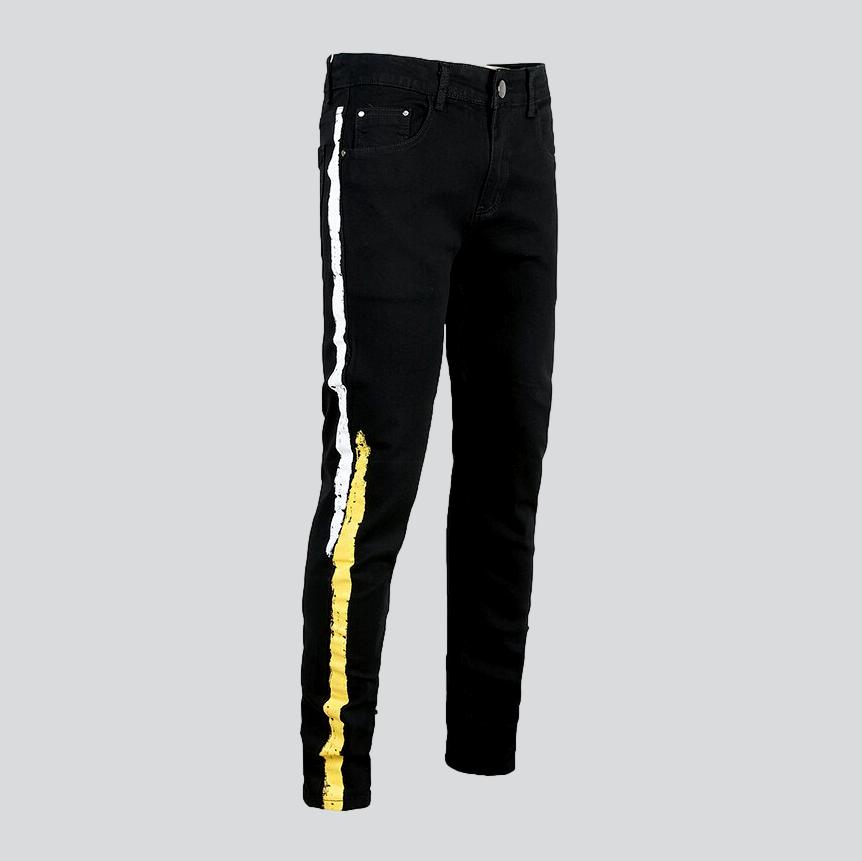 ¡Dale un toque de estilo con estos jeans para hombre con bandas amarillas y blancas de la colección Otoño-Invierno 2023! Ya sea que quieras lucir un look vaquero clásico o adoptar el estilo ecléctico Y2K, estos jeans de cintura media presentan un diseño pintado especial y parches únicos que los hacen impactantes. También cuentan con cierre de cremallera y botón. Tejido elástico para mayor comodidad y un corte ajustado que estiliza tu figura.