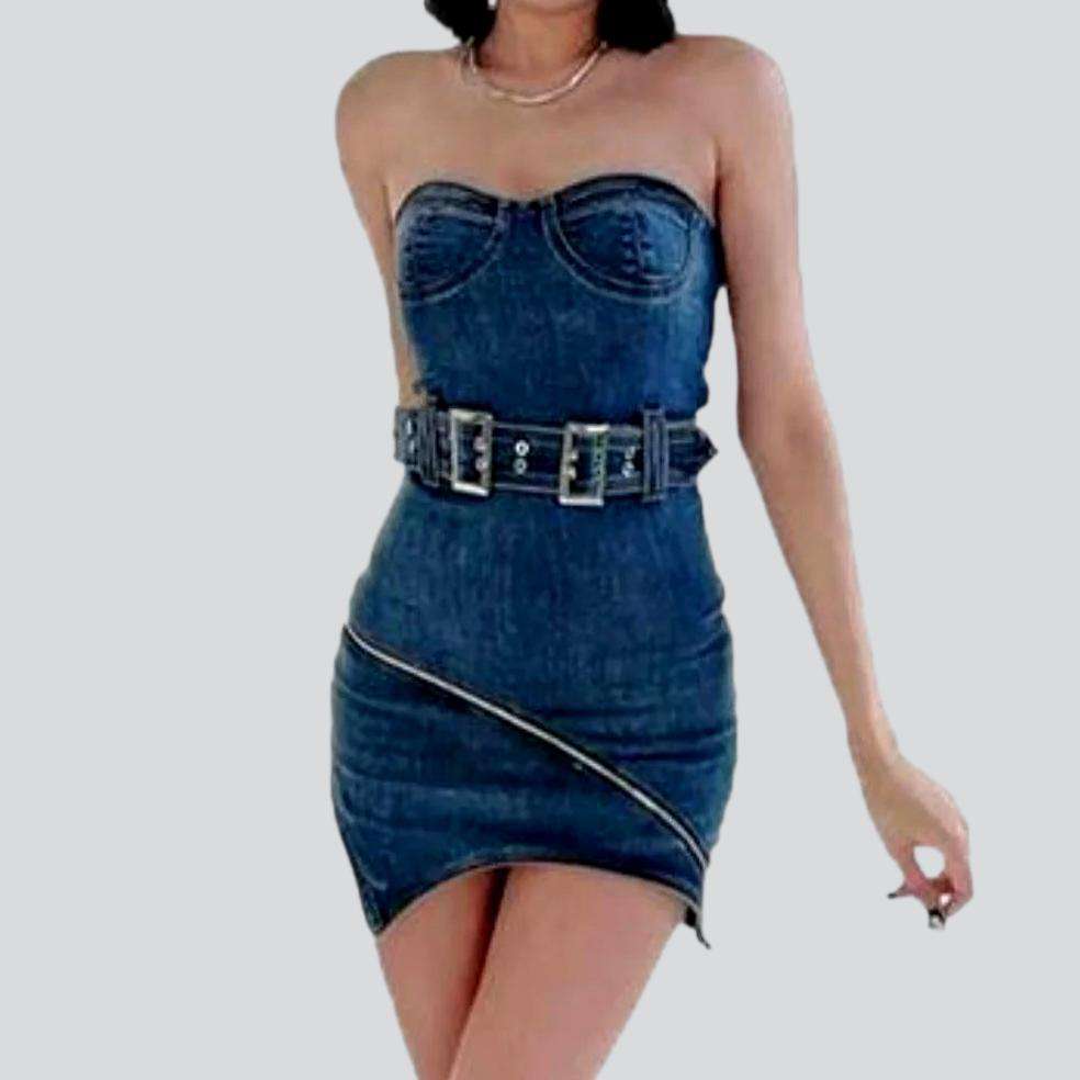 Be a part of the 2023 Spring-Summer Collection with this stunning asymmetric miniature strapless denim dress. a tribute to the Y2K era! Crafted with a timeless silhouette and a vibrant medium wash. this dress is the perfect way to honor the past while embracing the future.