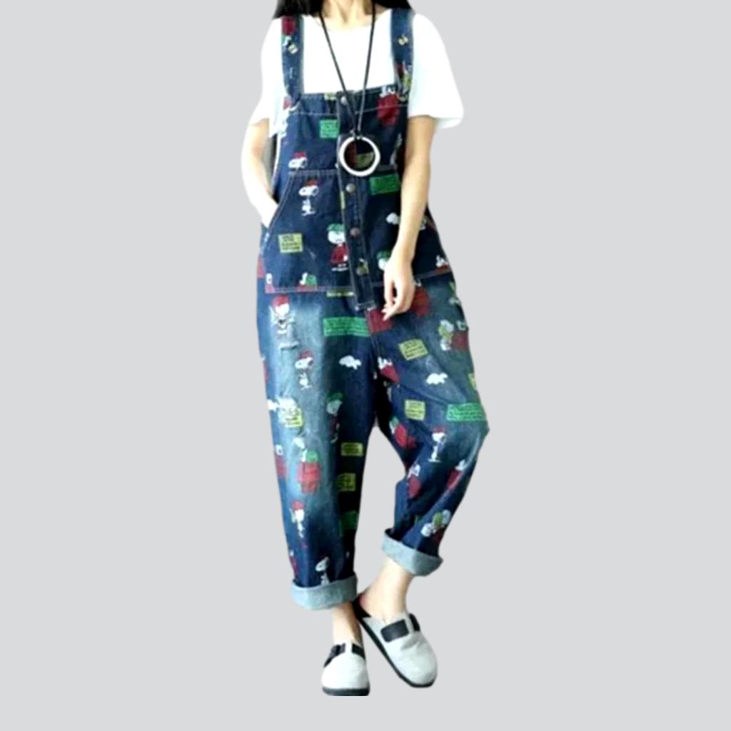 Be bold and stand out from the crowd in this unique denim jumpsuit. Show off your style and make a statement with this baggy. sanded. mid wash. cartoon print jumpsuit. With its y2k vibes. painted finish. and suspenders closure. you'll be the center of attention wherever you go!