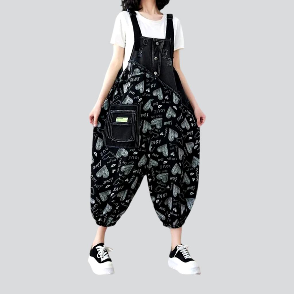 Introducing the 2023 Spring Collection's baggy painted denim jumpsuit with heart print. cargo style. and suspenders closure the perfect combination of comfort and style!