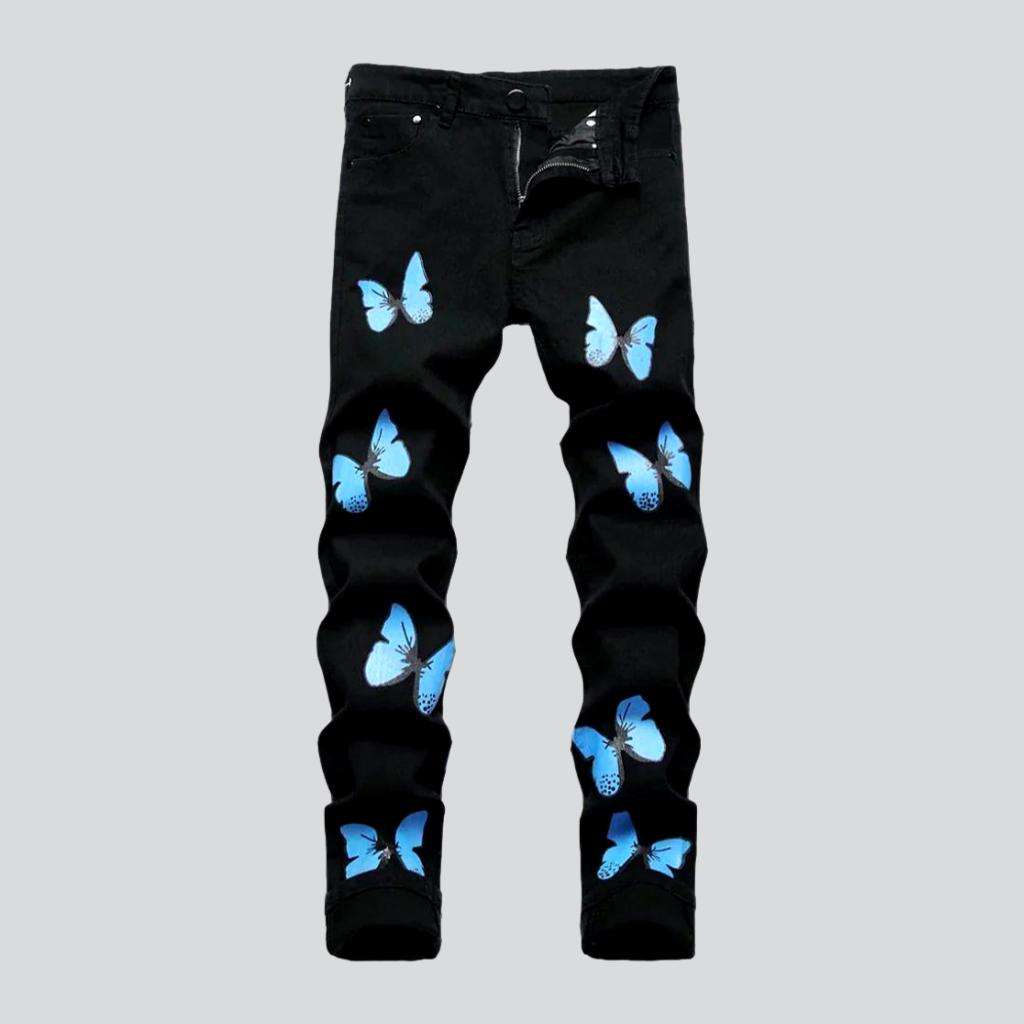 Make a statement with these blue butterfly print men's jeans from our 2023 Spring-Summer Collection! Featuring a unique y2k-inspired painted design. these tight mid-waist jeans are the perfect way to express your individuality and celebrate the trend renaissance. Crafted with premium quality denim. the jeans are equipped with a zipper and button closure for a secure fit and maximum comfort.