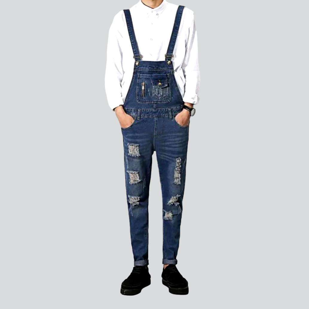 Introducing our blue frayed men's denim jumpsuit from the 2023 Spring-Summer Collection. With its urban style flair. distressed details. slim fit. suspenders. and button closure. this jumpsuit is perfect for making a bold statement and turning some heads!