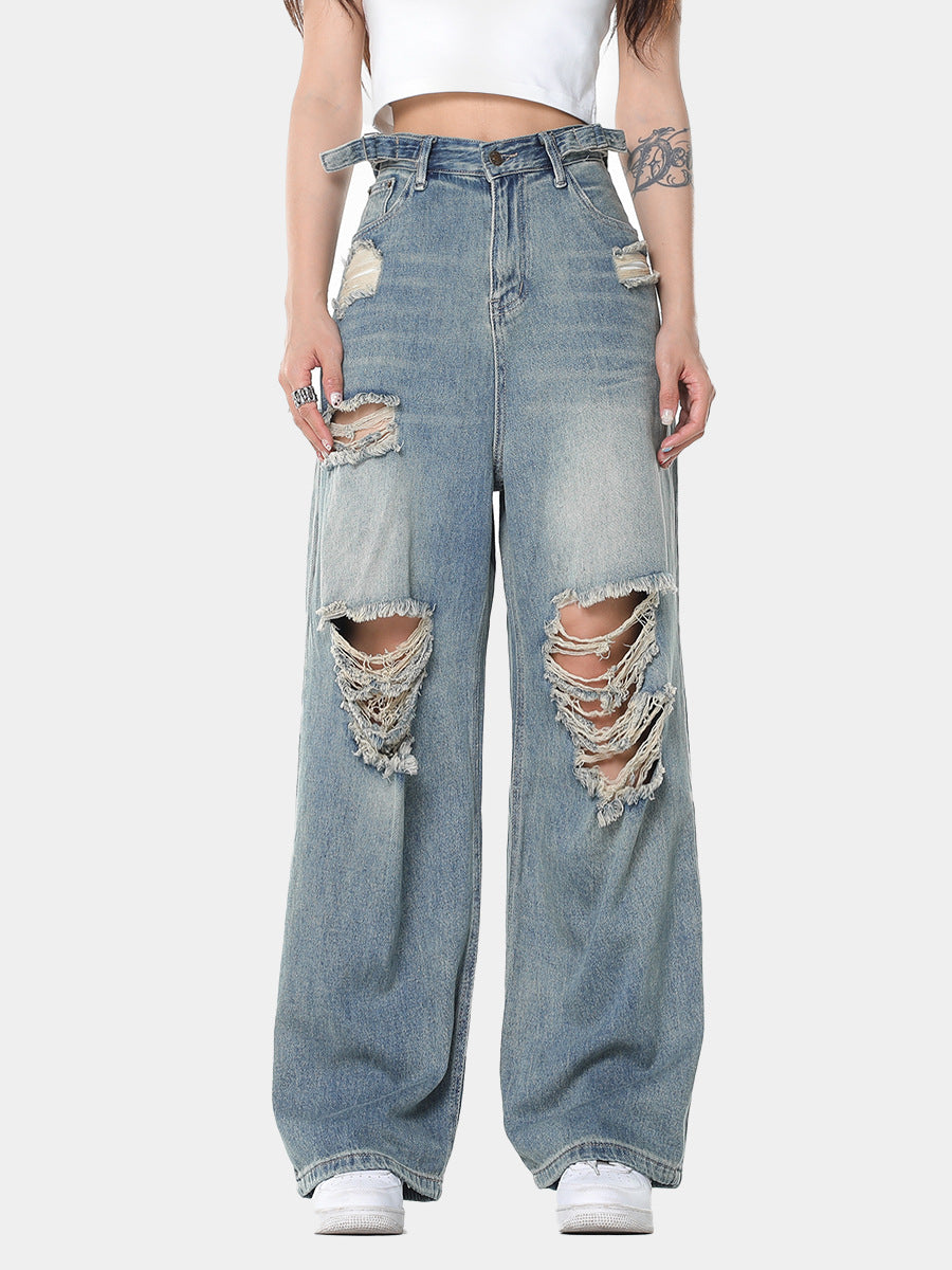 Embrace the edgy. distressed trend with these eye-catching blue denim wide-leg pants. These jeans feature large rips and holes throughout. adding a rebellious touch to their classic design. The high-waisted fit enhances your silhouette. while the loose. baggy leg provides comfort and style. The light wash gives them a vintage feel. making them perfect for creating a retro-inspired outfit. Pair them with a simple white top and sneakers for a casual daytime look or dress them up with heels and a crop top for a night out.