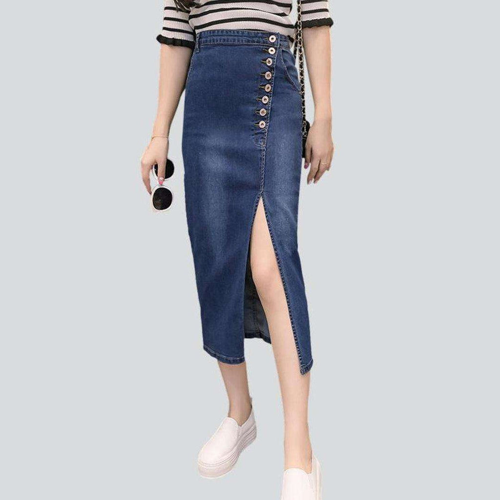 Introducing our 90s-trend button-down slit denim skirt from the 2023 Spring-Summer Collection ââ‚?an iconic piece that captures nostalgic fashion with contemporary refinement!