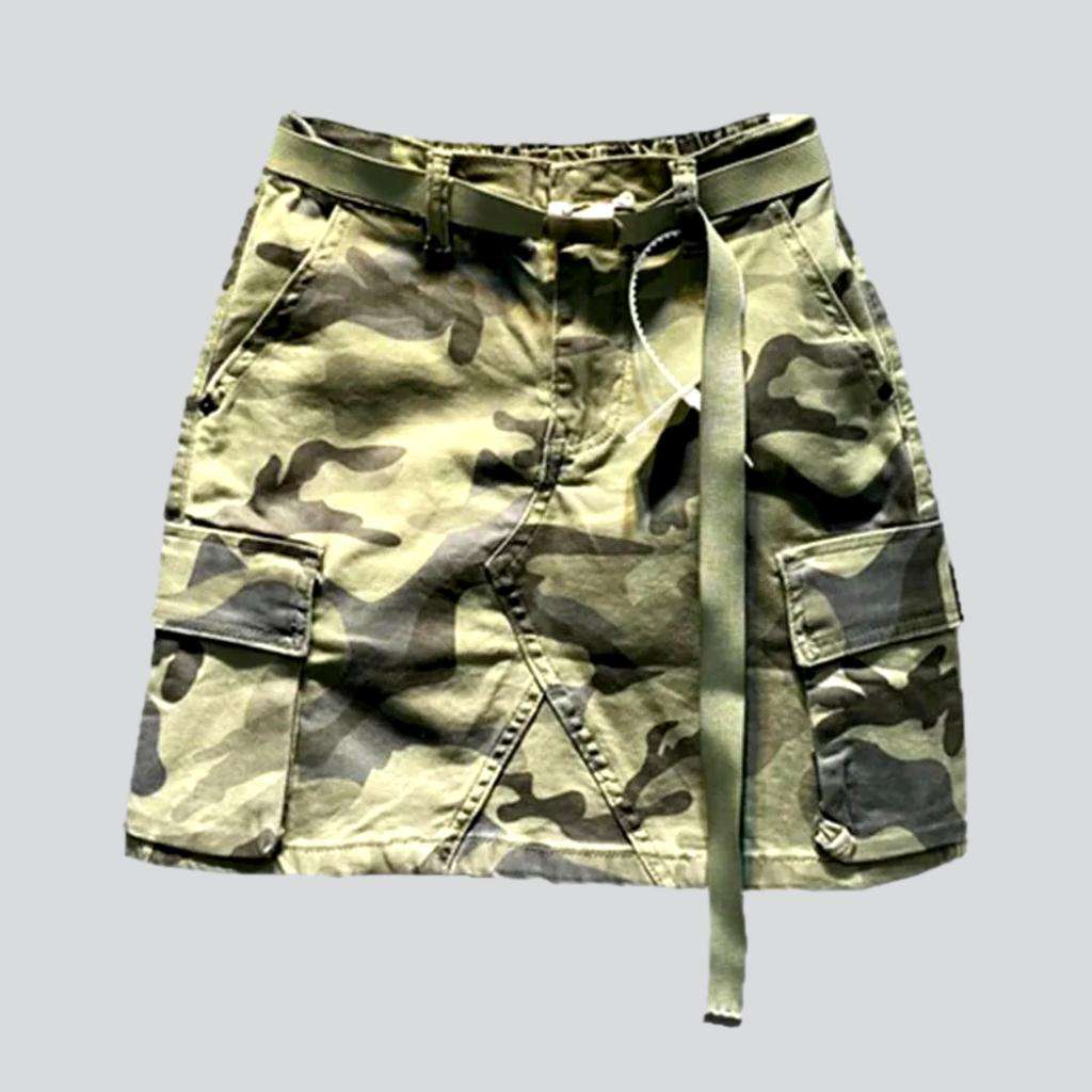 A quintessential piece for the couture fashionista. this denim skirt is the perfect combination of street urbane-trend and conventional chic. Its camouflage print adds an edge of edginess while the cargo design adds a touch of versatility.