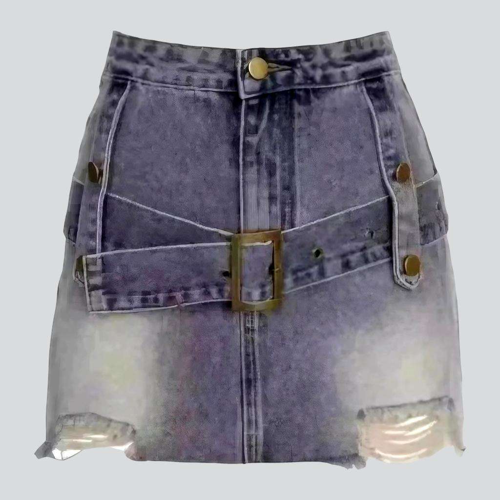 Take your style game to the next level with our 2023 Summer Collection Punkish-Style Contrast Denim Skirt! This distressed mini skirt is designed to fit flawlessly. featuring a mid-waist silhouette. zip and button closure. and two belts for added drama.