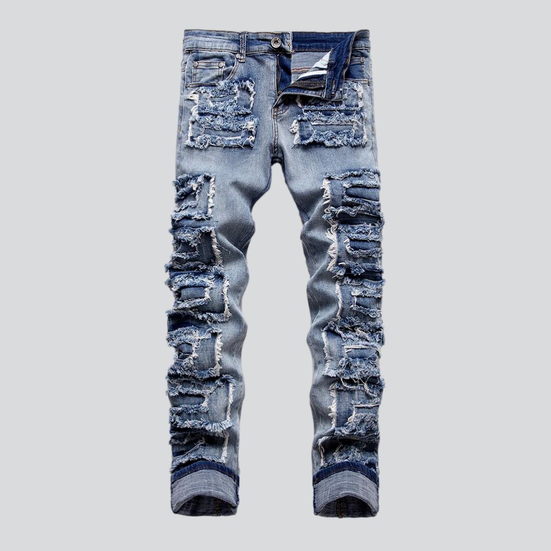 Introducing the 2023 Spring-Summer Collection's distressed patchwork jeans for men urban style at its finest! With a slim fit. mid-waist and zipper & button closure. they are crafted from stretchy. relaxed material that's perfect for all-day wear.
