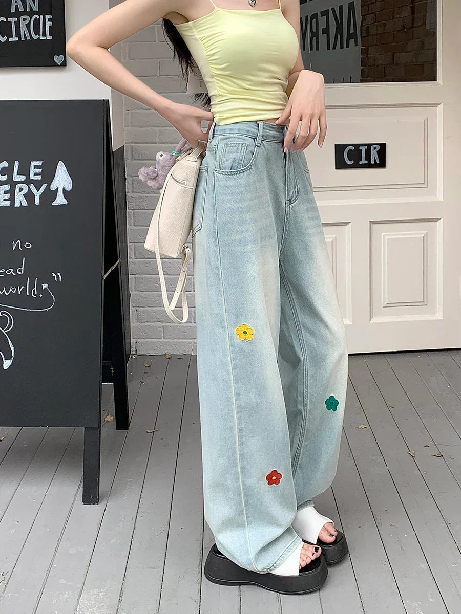 Embroidered Flower Retro High Waist Wide-leg Jeans