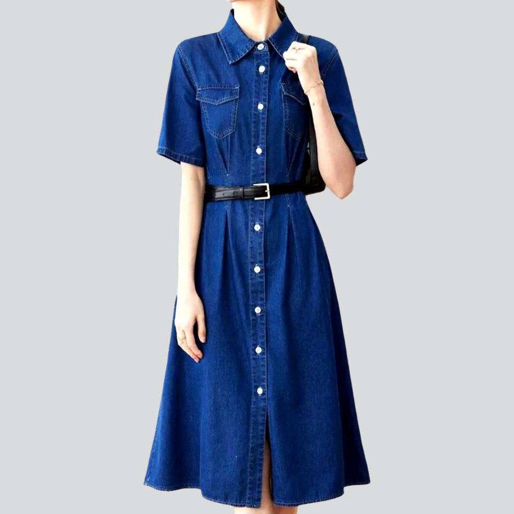 Introducing our stylish 2023 Summer Collection Shape-and-Flare Jeans dress the perfect fusion of leisurely comfort and conventional fashion! With a medium-wash denim fabric. buttoned closure and a shape-and-flare silhouette. this dress is sure to make you the star of the show!
