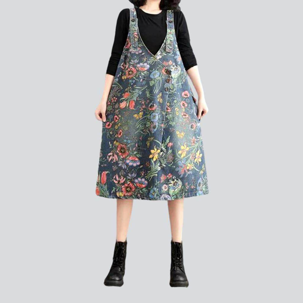 Introducing the 2023 Summer Collection's fashionable full floral print midi denim dress ââ‚?a timeless statement of style and sophistication!