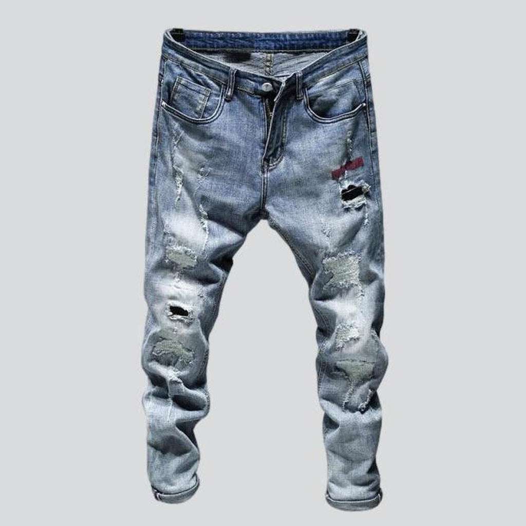 Discover the perfect edgy city vibe with our 2023 Spring-Summer Collection of light blue ripped men's jeans! With a slim. mid-waist design. these jeans feature stretchy fabric for all-day comfort and a secure zipper & button closure. Show off your style with these trendy and timeless jeans!
