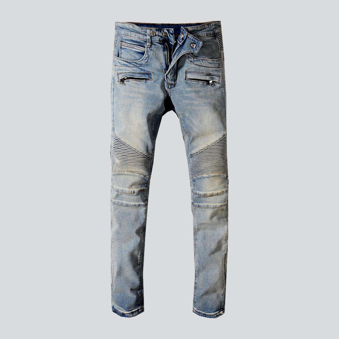 Welcome to the 2023 Spring-Summer Collection and the coolest biker jeans around light wash retro biker jeans. biker style! Combining vintage and modern fashion elements. these jeans are designed to help you stand out in the crowd.