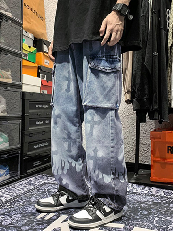 Design: Cutting to a straight-leg fit. these punk-vibe denim jeans featured cross pattern allover and flame print at cuffs. with cargo pockets patched and a zip button fasten design.