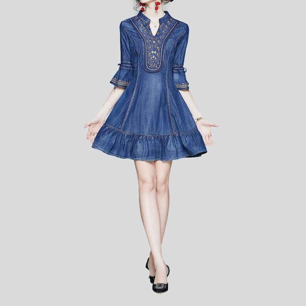 Tailored to perfection. this timeless piece is the perfect way to add a touch of sophistication to your wardrobe. Step out in style and make history with our mini flare embroidered denim dress!