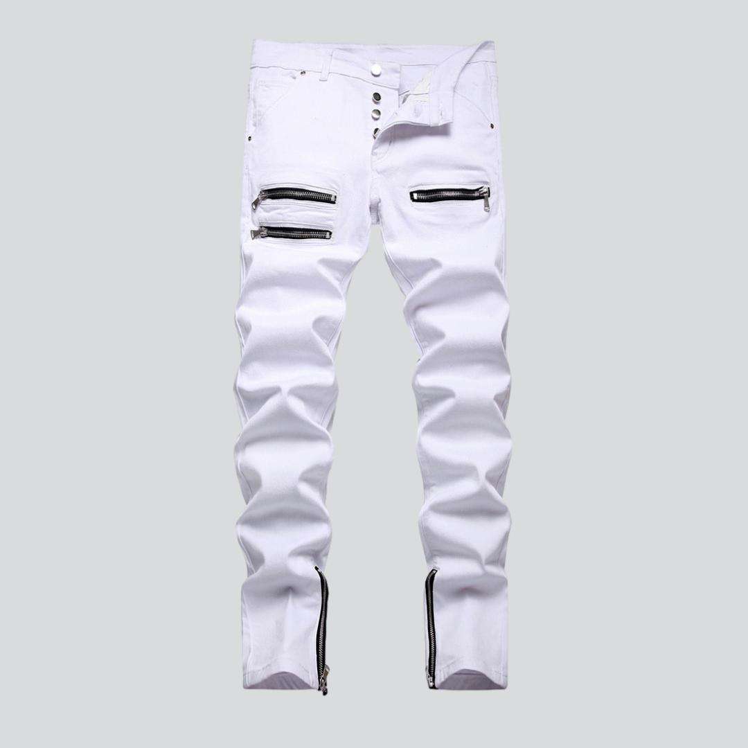 Introducing the 2023 Spring-Summer Collection's newest addition ââ‚?monochrome white jeans with zippers! Taking casual vibe to the next level. these skinny mid-waist jeans are the perfect blend of comfort and class. With a stretchy material. buttoned closure. and a sleek zip-front design. you'll be turning heads no matter where you go!