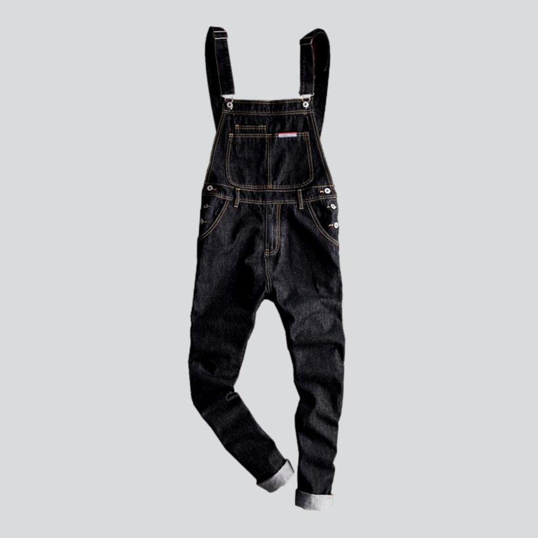 Introducing our 2023 Autumn-Winter men's y2k-style slender black jeans jumpsuit a stylish way to make a statement! Crafted from a monochromatic black material. this jumpsuit features suspender straps and a row of buttons to secure the closure. Perfect for any occasion. this thin-cut jumpsuit is the best way to stand out in a crowd.
