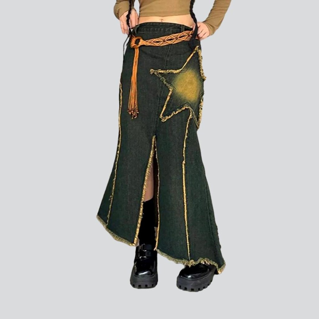 Introducing our star embroidery trumpet denim skirt from the 2023 Autumn Collection ââ‚?the perfect mix of millennium flair and contemporary fashion!