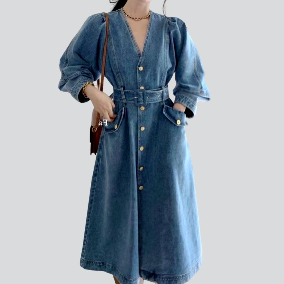 Soak up the sun in style this season with our v-neck modern long denim dress from the 2023 Spring-Summer Collection! With its medium wash. fit and flare design. and buttoned closure. this timeless piece is a perfect harmony of vogue elegance and retro chic.