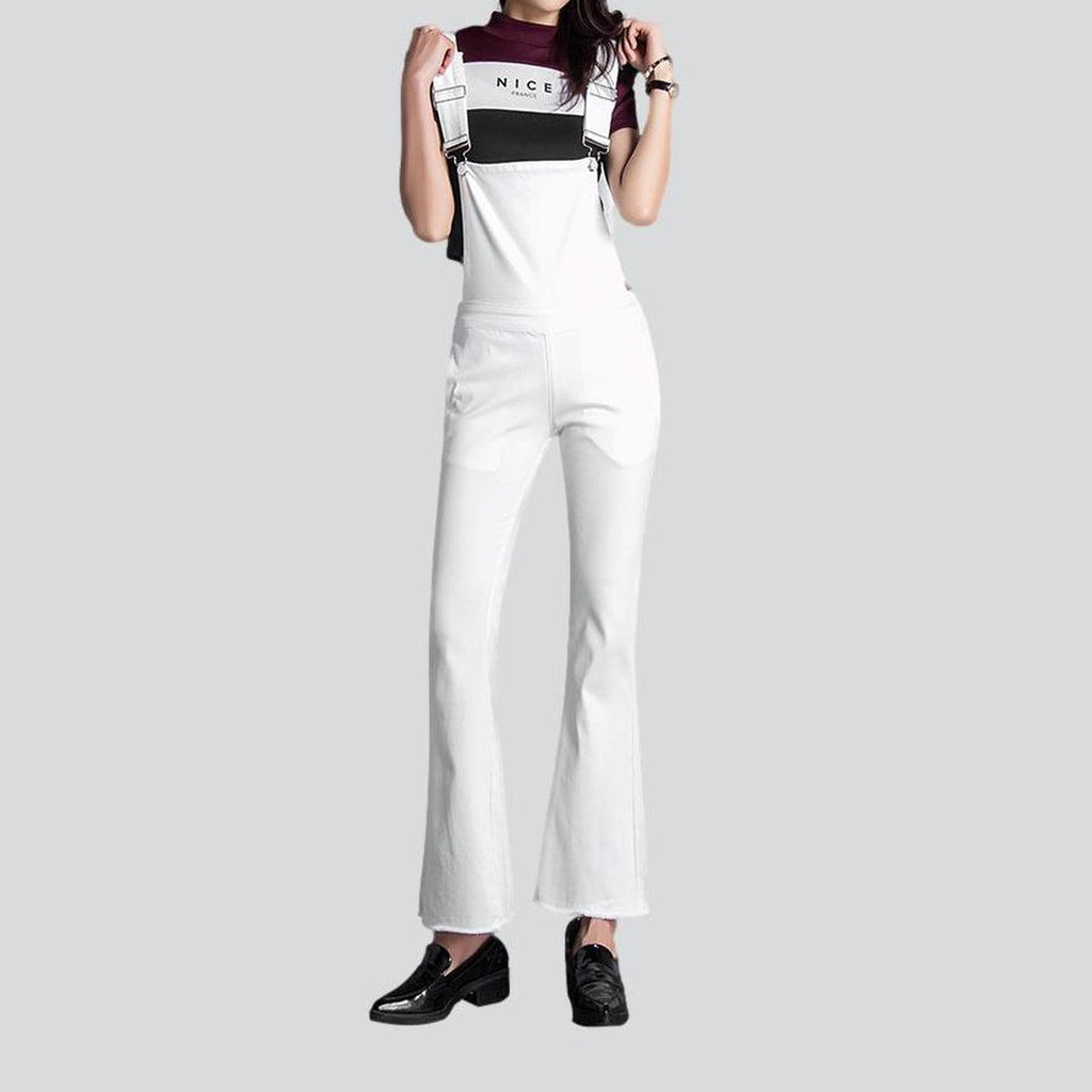 Welcome to the future of streetwear style: our 2023 Spring-Summer Collection white bell-shaped women's denim jumpsuit! Stylish and on-trend. this jumpsuit is sure to make a statement wherever you go. Flaunt your fashion-forward look with this classic monochrome piece. featuring a unique and distinctive design.
