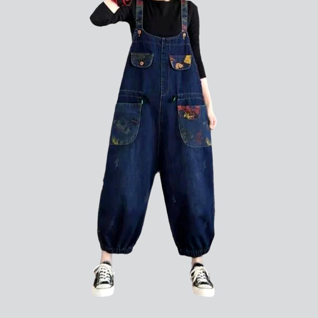 This Y2K inspired jumpsuit is sure to be a head-turner. The unique combination of painted details. free fit. dark wash. and rubber leg hem will give you an effortlessly cool look that will make you the envy of all your friends. With this jumpsuit. you'll be able to make a fashion statement wherever you go!
