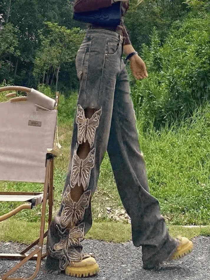 Eye-Catching Butterfly and Hollow Hole Design: The jeans feature captivating butterfly and hollow hole designs. adding an alluring and distinctive element to your outfit.