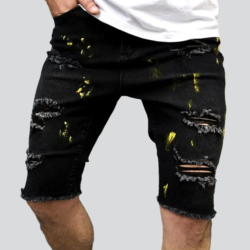Make a statement this summer with these yellow-painted distressed denim shorts. These shorts will ensure you look your best without compromising on comfort. Perfect for a day at the beach. a picnic in the park. or an evening out with friends. these shorts are a must-have for the summertime.